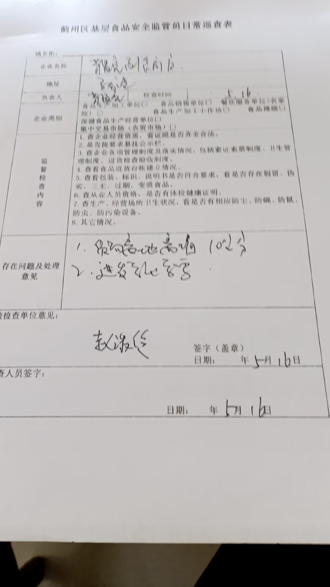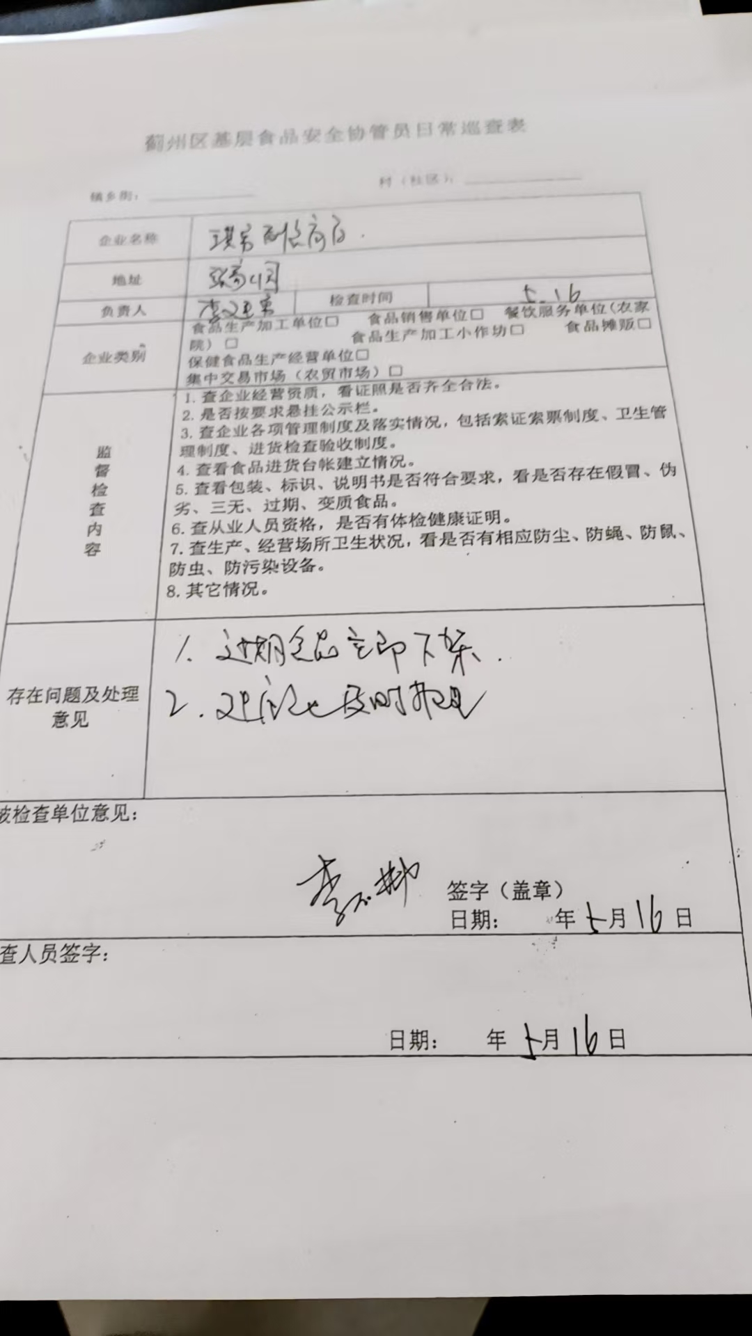 2025年5月16日,为确保本镇百姓的食品药品饮食安全,镇食安办安排基层食药品安全监管员,对镇域超市、餐馆进行全面检查。检查结果显示部分存在问题,安全监管员责令其立即整改。