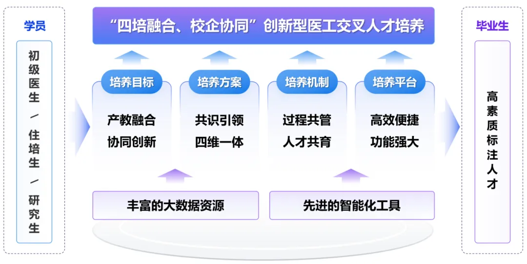 二是构建四培融合,孵化“新医科”人才。围绕医工交叉标注人才培养目标,构建出“共识引领、四维一体”多层次人才培养方案。建立“过程共管、人才共育”的校企协同培养机制。打造智能专业化培养平台,从多维度发力,实现创新型“新医科”人才全流程培育。
