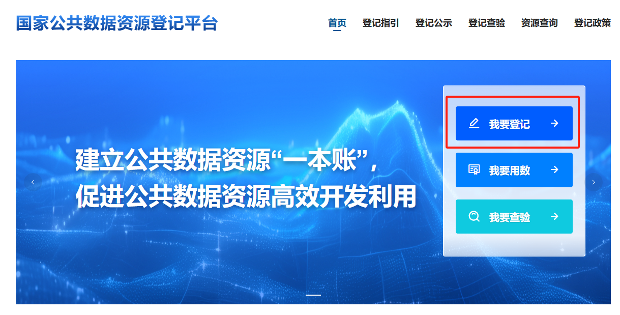 登录国家公共数据资源登记平台官网后,点击右上角【注册】或【我要登记】进行登记主体账号注册。