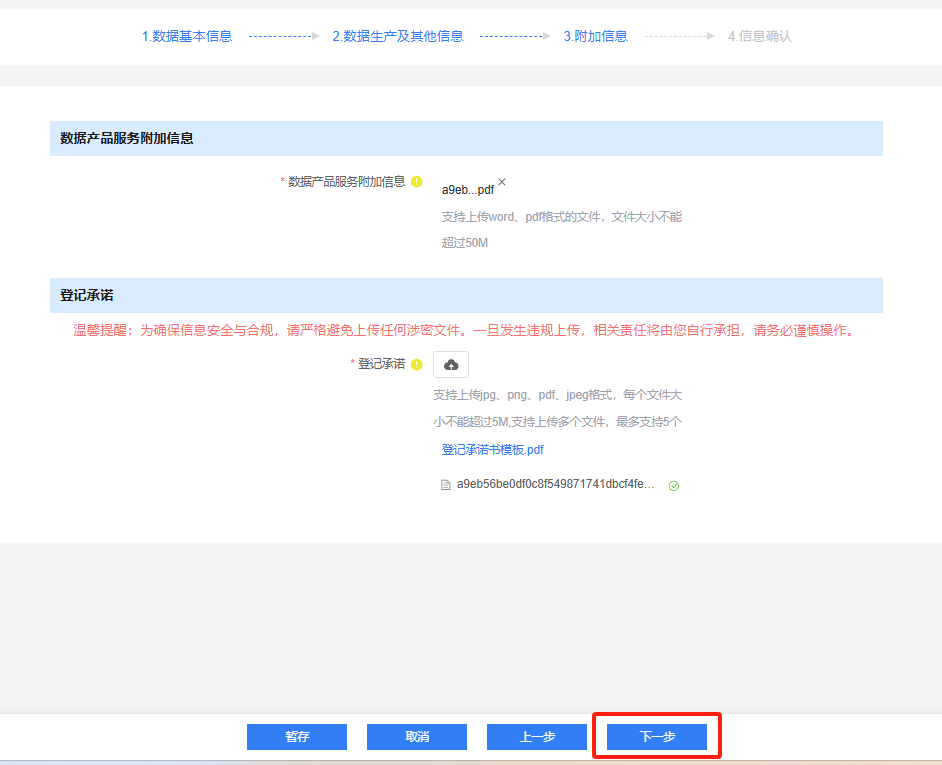 在登记页面上传数据资源或数据产品相关说明文档、登记承诺书,点击【下一步】进入后续填写页面。相关文档提供模板参考。