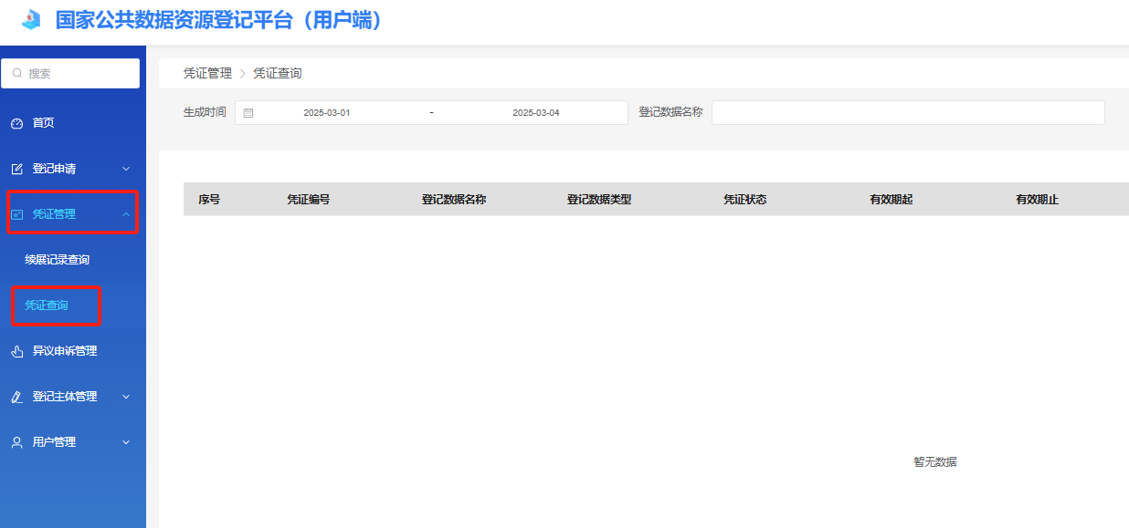 公示结束后,可在用户后台页面【凭证管理】页中查看登记结果信息。并可在登记平台门户牌九【登记查验】页面进一步查询。