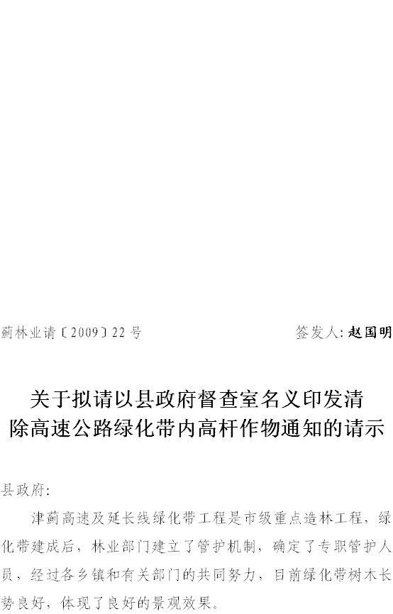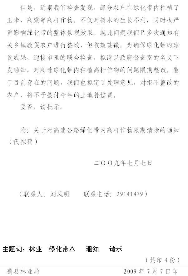 近期我们检查发现,部分农户在绿化带内种植了玉米、高粱等高秆作物。不仅对树木的生长不利,同时也严重影响绿化带的整体景观效果。就此问题我们已多次通知有关乡镇敦促农户进行整改,但收效甚微。为确保绿化带的建设成果,迎接市里的联合检查,拟请以政府督查室的名义下发通知,对高速绿化带内种植高秆作物的问题限期整改。